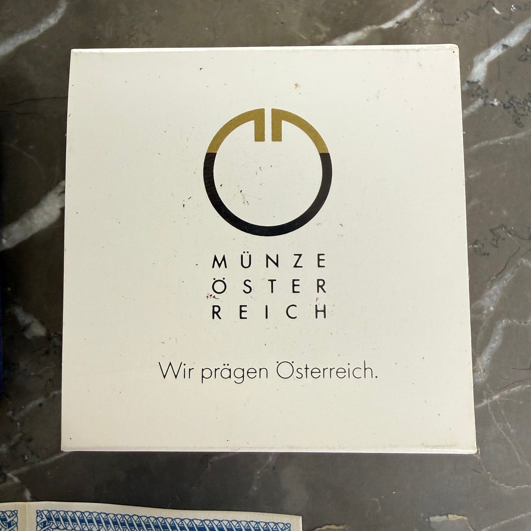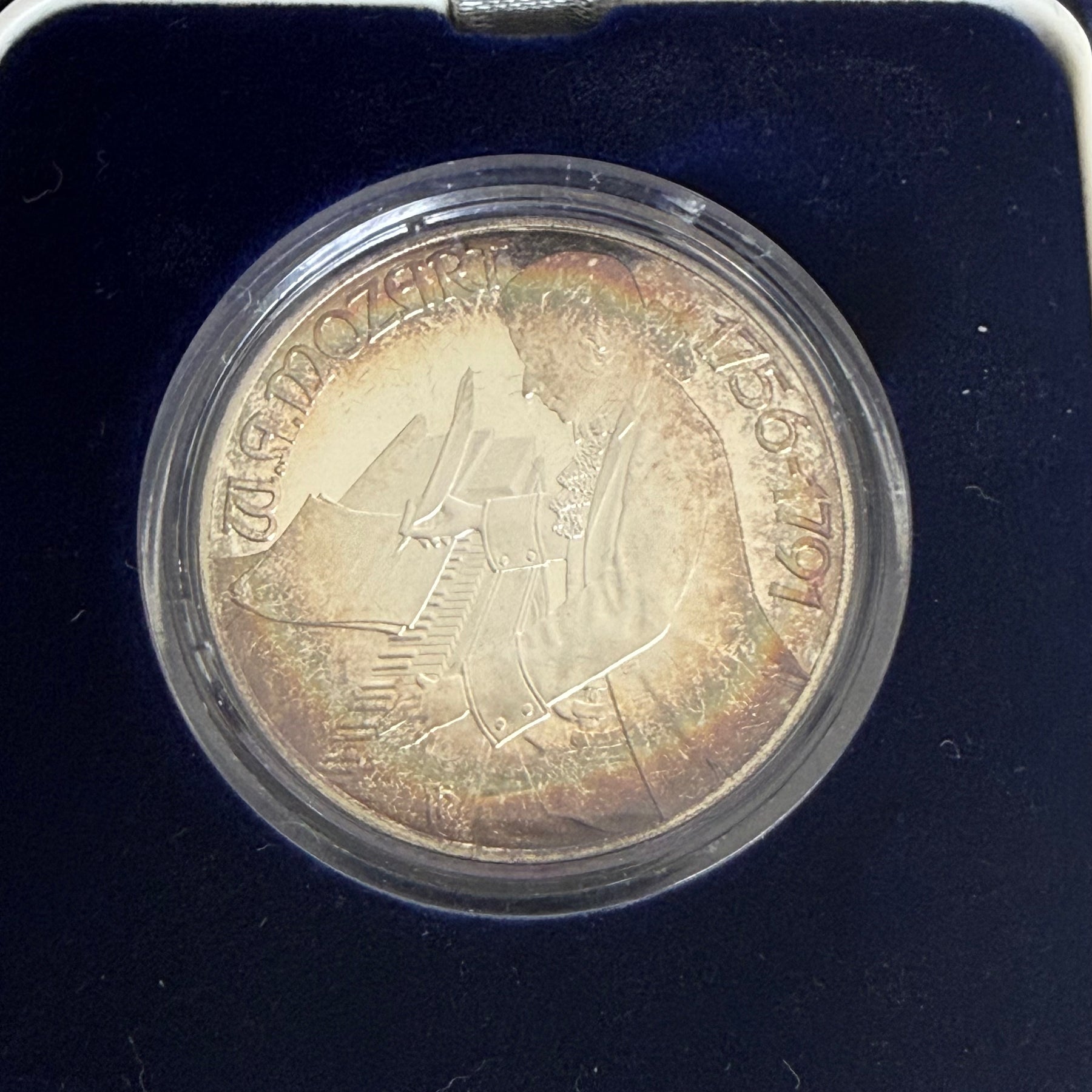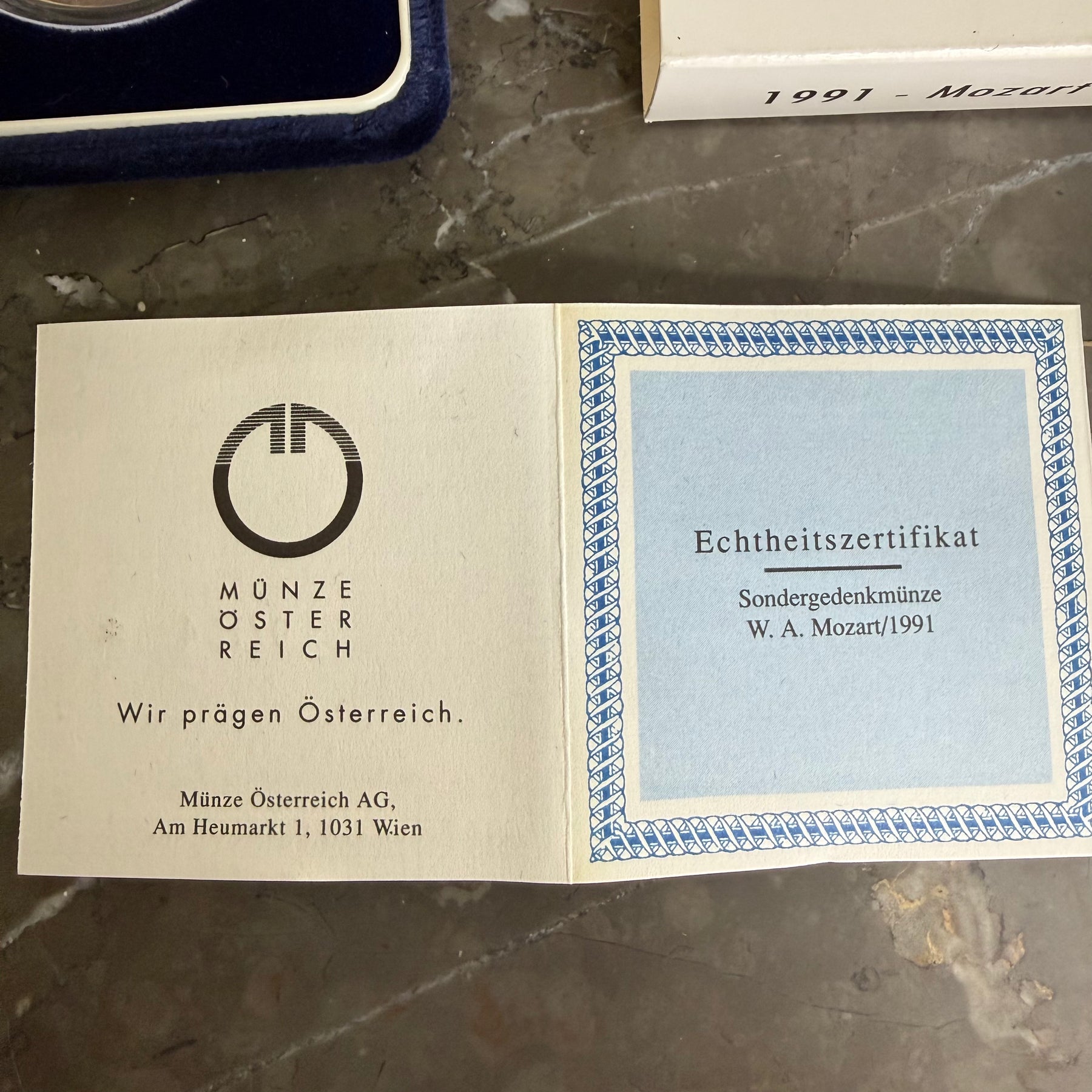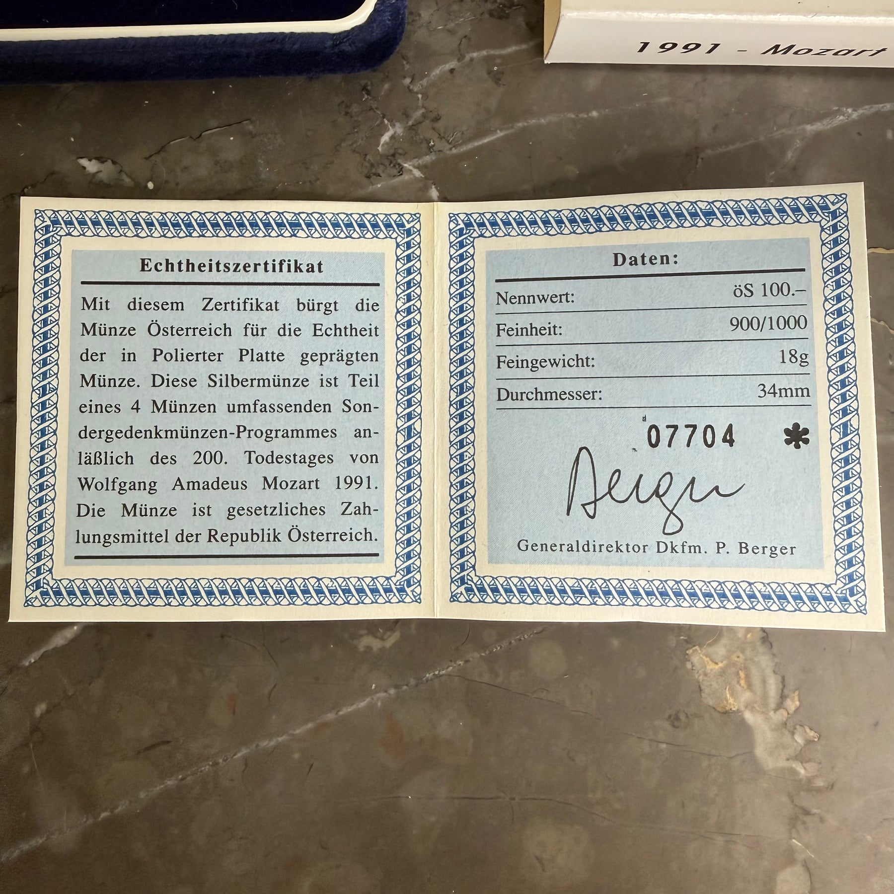 Moneta commemorativa in argento della Münze Österreich, coniata in Polierter Platte (finitura a specchio) con certificato di autenticità. Parte della serie speciale di quattro monete dedicate al 200° anniversario della morte di Wolfgang Amadeus Mozart nel 1991. Questa moneta d'argento è riconosciuta come corso legale della Repubblica d'Austria. Un pezzo da collezione che unisce valore numismatico e storico, garantito dall'ente ufficiale di coniazione austriaco.