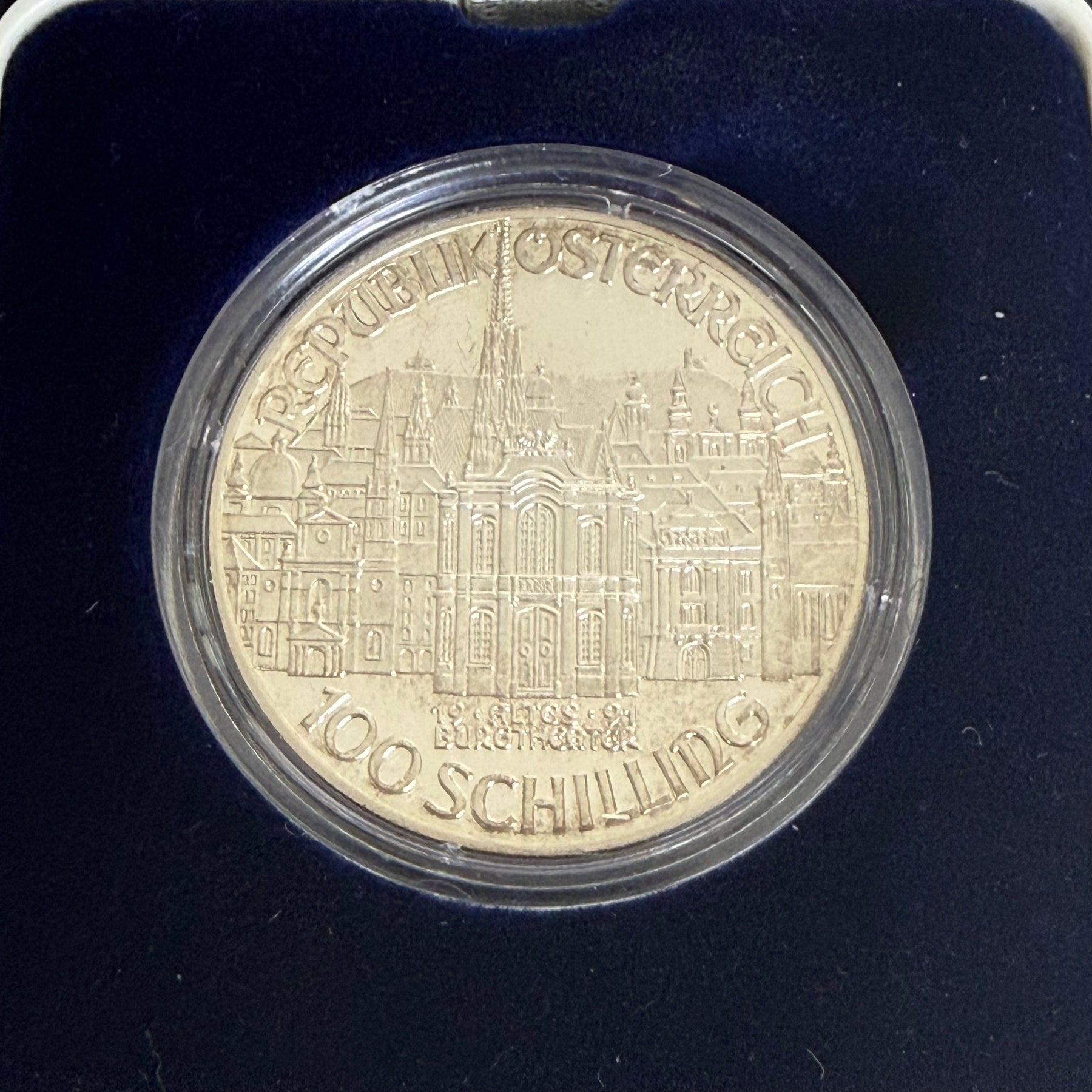 Moneta commemorativa in argento con valore nominale di 100 scellini austriaci. Realizzata in argento 900/1000 con peso netto di 18 grammi e diametro di 34 millimetri. Questa moneta d'argento, coniata secondo gli standard della Münze Österreich, rappresenta un esemplare di pregio per collezionisti e appassionati di numismatica. La composizione in argento puro e le dimensioni precise garantiscono autenticità e valore duraturo nel tempo.