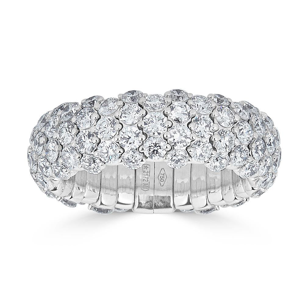 Questo delizioso anello elastico in oro 18 carati presenta 3,82 carati di scintillanti diamanti rotondi, in un look classico ed elegante. L'azione estensibile rende questo anello facile e comodo da indossare e togliere, mentre la sua eccezionale lavorazione garantisce che le molle siano robuste e durevoli. La misura dell'anello è realizzata su ordinazione. Realizzato a mano in Italia da ZYDO Italian Jewelry. Qualità del diamante: Colore F, Purezza VS Peso in carati del diamante: 3,82 Dimensioni: Larghezza: 5/16 di pollice.