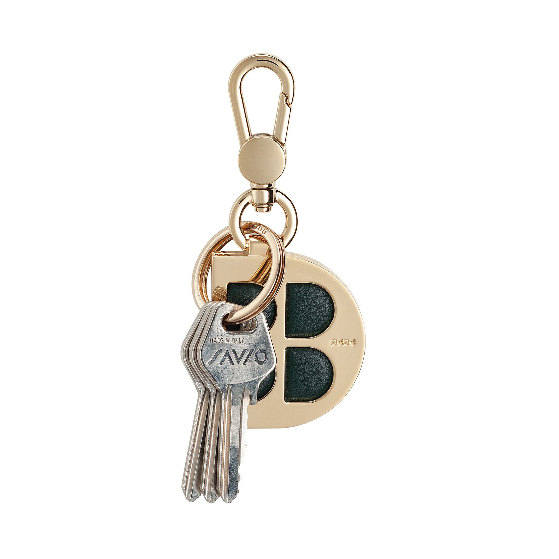 DUDU Portachiavi in Metallo a Forma di D con Inserti in Vera Pelle, Portachiavi Dorato con Moschettone e Anello, Portachiavi per Auto Casa Ufficio