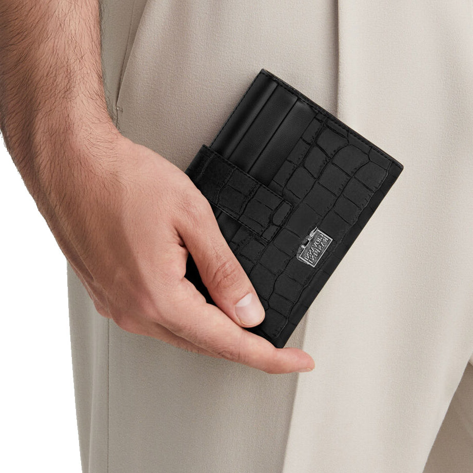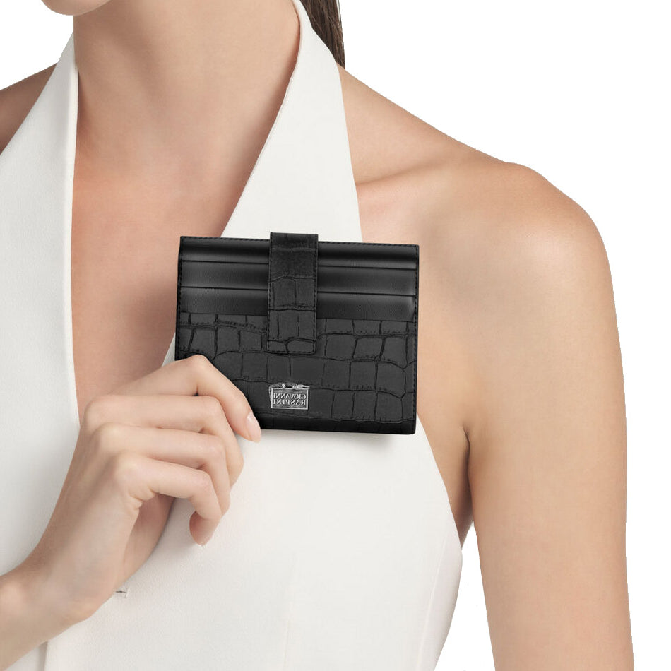 Un'eleganza senza tempo prende forma in questo esclusivo portafoglio portacarte, realizzato artigianalmente in pregiata pelle croco nera. Il pellame, un vitello lucido di altissima qualità, riproduce fedelmente la texture sofisticata del coccodrillo, conferendo al prodotto un carattere deciso e distintivo. Compatto ma sorprendentemente capiente, offre una grande tasca centrale e 12 scomparti portacarte, sapientemente distribuiti: 6 all’interno e 6 all’esterno, per una gestione ottimale dello spazio. La chiusura con fascetta e bottone a pressione garantisce sicurezza e praticità, senza rinunciare allo stile. A impreziosire l'accessorio, un dettaglio iconico in argento raffigurante il logo del brand.