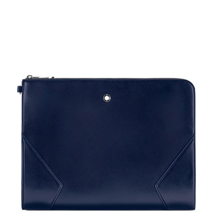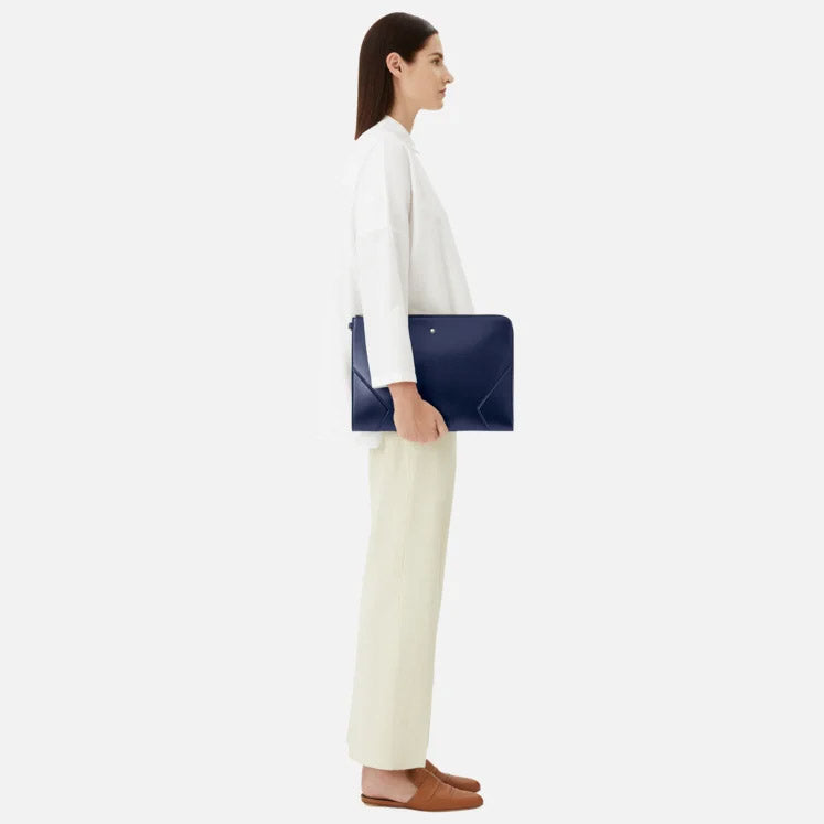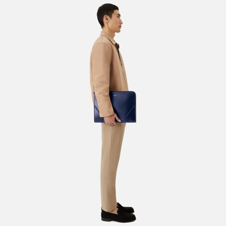 Il portadocumenti Meisterstück di Montblanc è il perfetto compagno per il quotidiano. Realizzato in pelle lucida Ink Blue, con impunture e cursore ispirati ad un pennino, è ideale per chi apprezza l'arte della scrittura. Il logo impreziosisce la borsa, conferendo un tocco di eleganza.