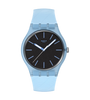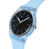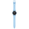 Questo orologio presenta un quadrante nero testurizzato con tacche delle ore stampate in azzurro, lancette delle ore e dei minuti azzurre che si illuminano al buio e una lancetta dei secondi bianca in una cassa biosourced trasparente opaca di colore azzurro con vetro biosourced. Completa l’orologio un cinturino testurizzato color azzurro opaco con fibbia e passante azzurro opaco e trasparente.