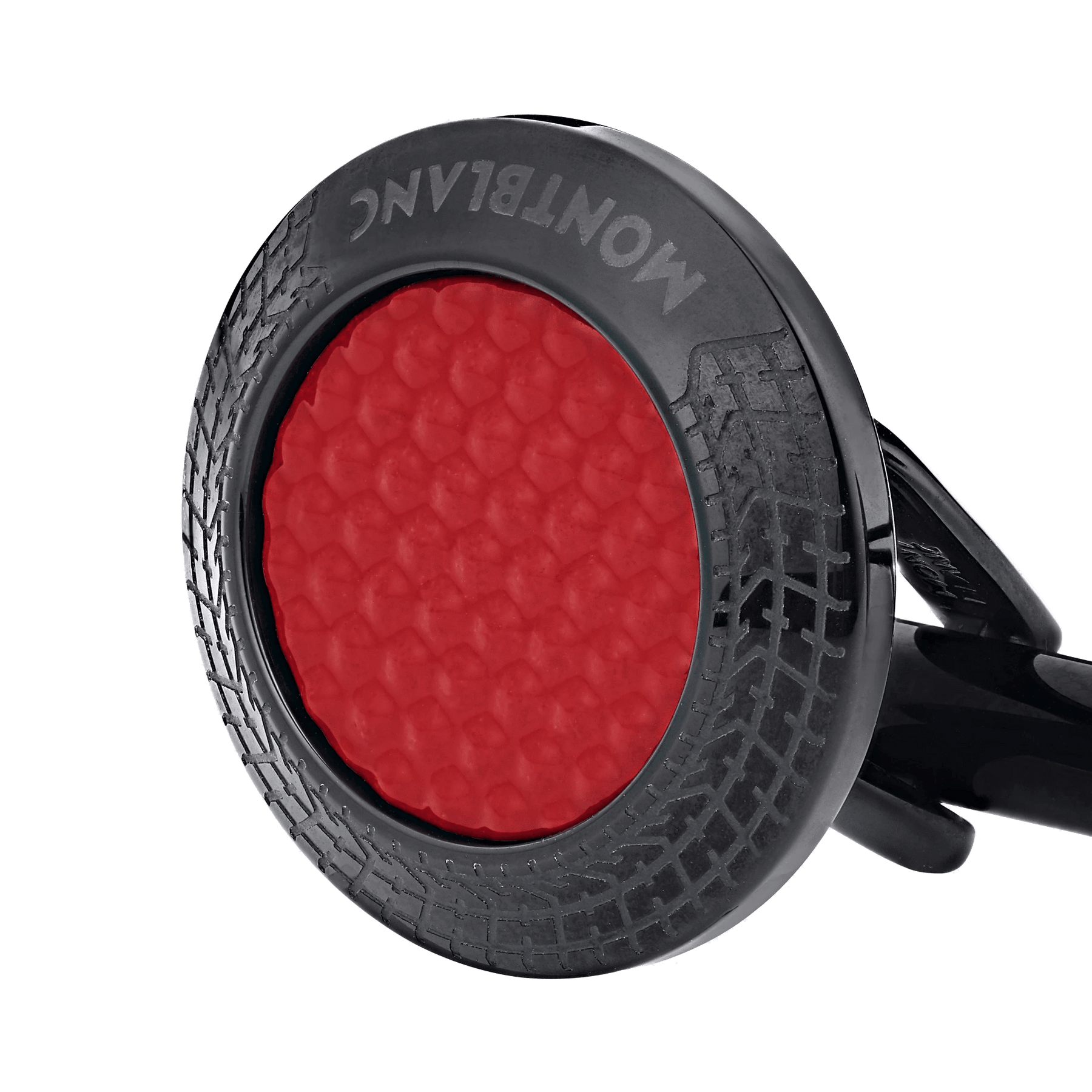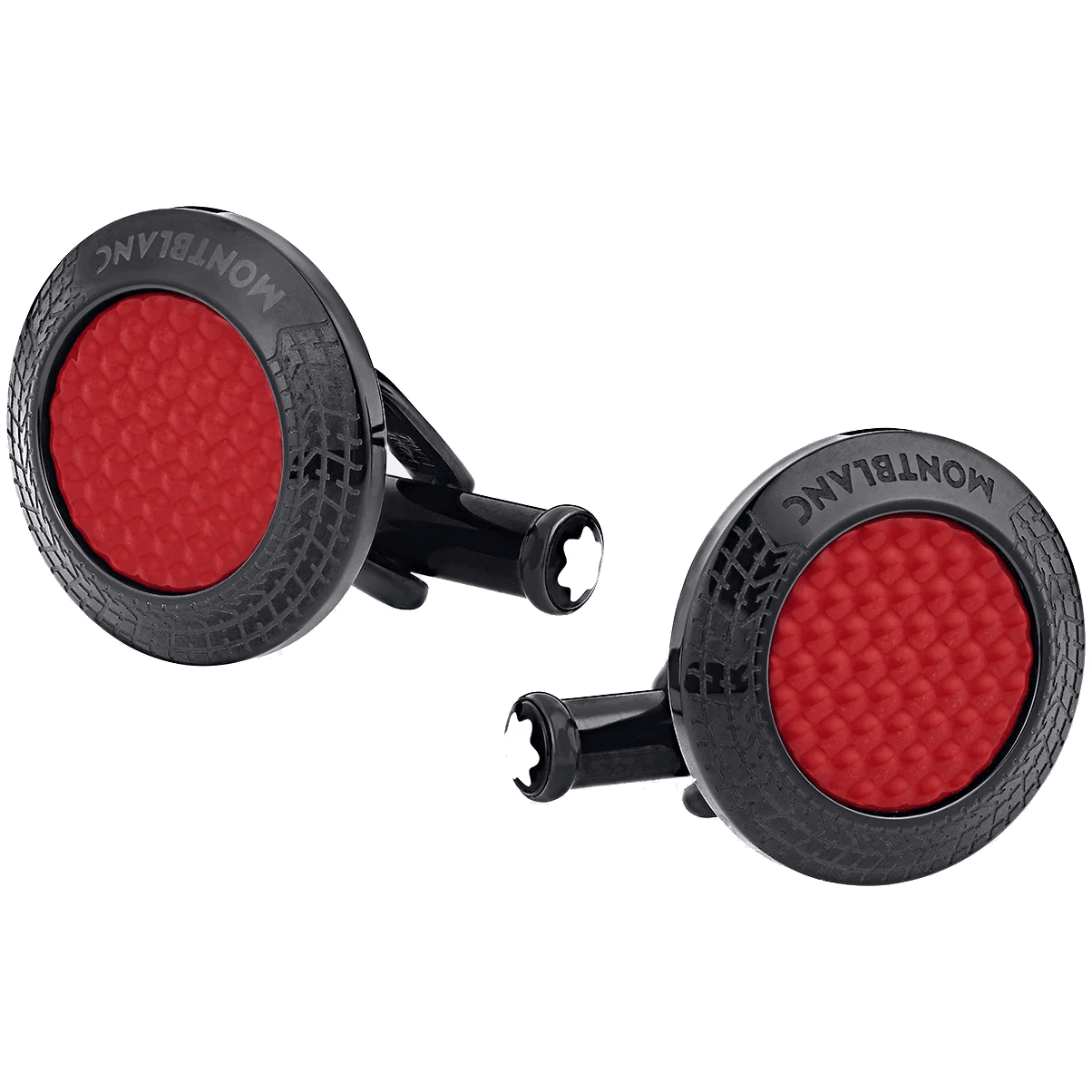 Kulaté manžetové knoflíčky Montblanc Meisterstück Great Masters Pirelli z nerezové oceli jsou vyraženy se vzorem stopy pneumatiky a mají červeně lakovanou středovou plaketu.
