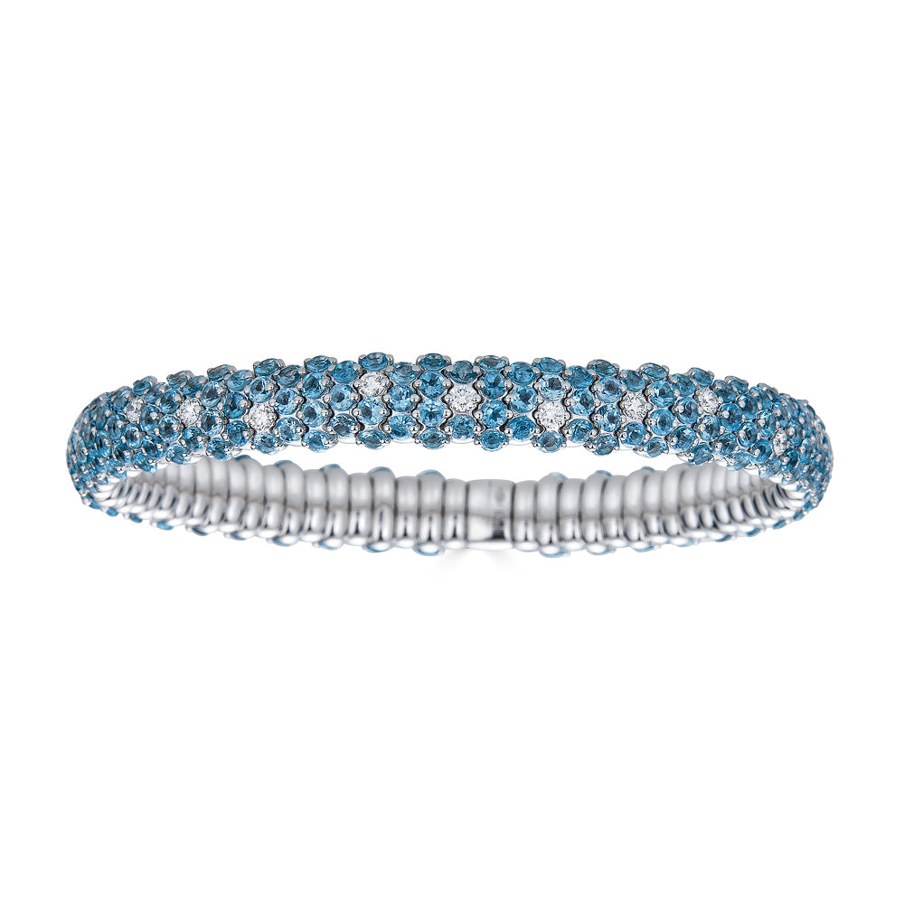 Tento ohromující strečový náramek z 18k bílého zlata obsahuje 12 karátů úžasného modrého topazu, doplněného 0,78 karáty třpytivými kulatými diamanty, pro barevný a poutavý vzhled. Díky natahovací akci se tento náramek snadno a pohodlně nasazuje a sundává, zatímco jeho výjimečné zpracování zajišťuje, že pružiny jsou pevné a odolné. Ručně vyráběné v Itálii od ZYDO Italian Jewelry. Kvalita diamantu: čistota VS, barva F Celková hmotnost diamantových karátů: 0,78 karátů Celková hmotnost modrých topaz karátů: 12 Velikost: Délka: 6,75 palce