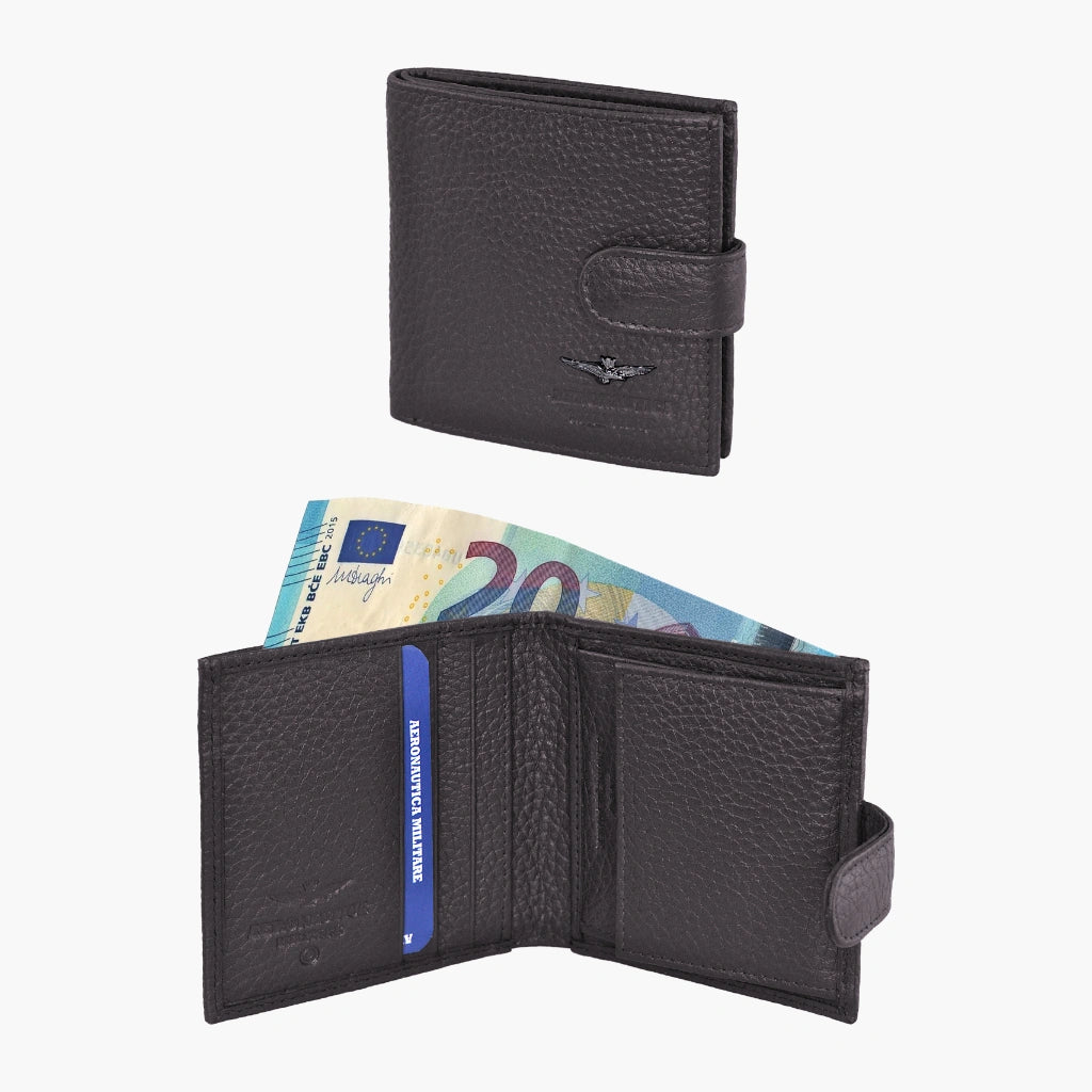 Lommepung i blødt ægte læder med møntholder, kendetegnet ved metalørnen og mærket Luftvåben . Det særlige læder gør pungen behagelig at have med i lommen, men opgiver samtidig ikke modstanden og elegancen fra ægte læder
