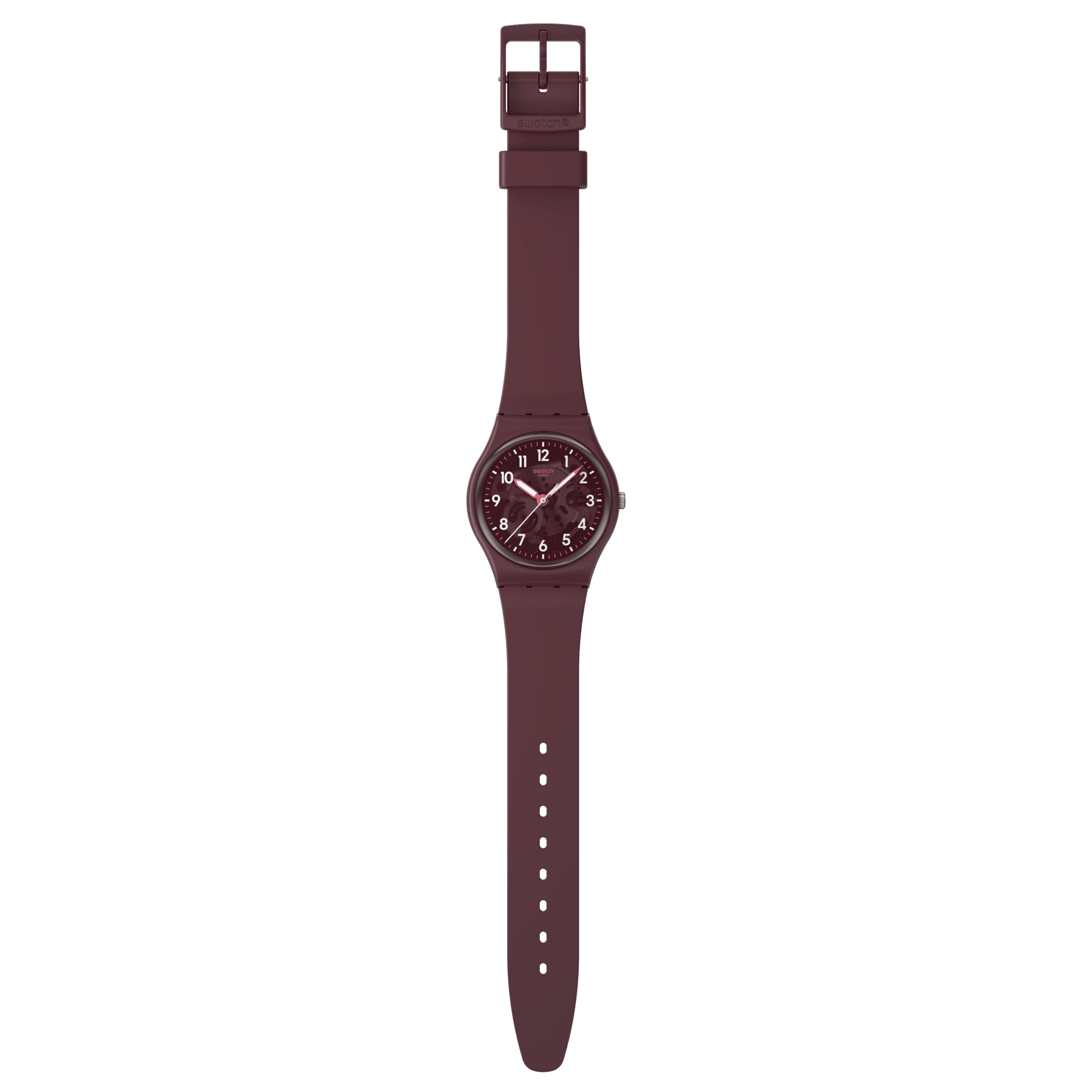 Dette Swatch-ur er et mesterværk inden for design og bæredygtighed. Den gennemsigtige bordeaux urskive afslører den fejlfri bevægelse, mens hvide visere og tal lyser op i looket. Takket være biosourcet glas er dette ur holdbart og bæredygtigt. Med et matchende mat bordeaux etui, rem, løkke og spænde er det den perfekte blanding af funktion og stil.