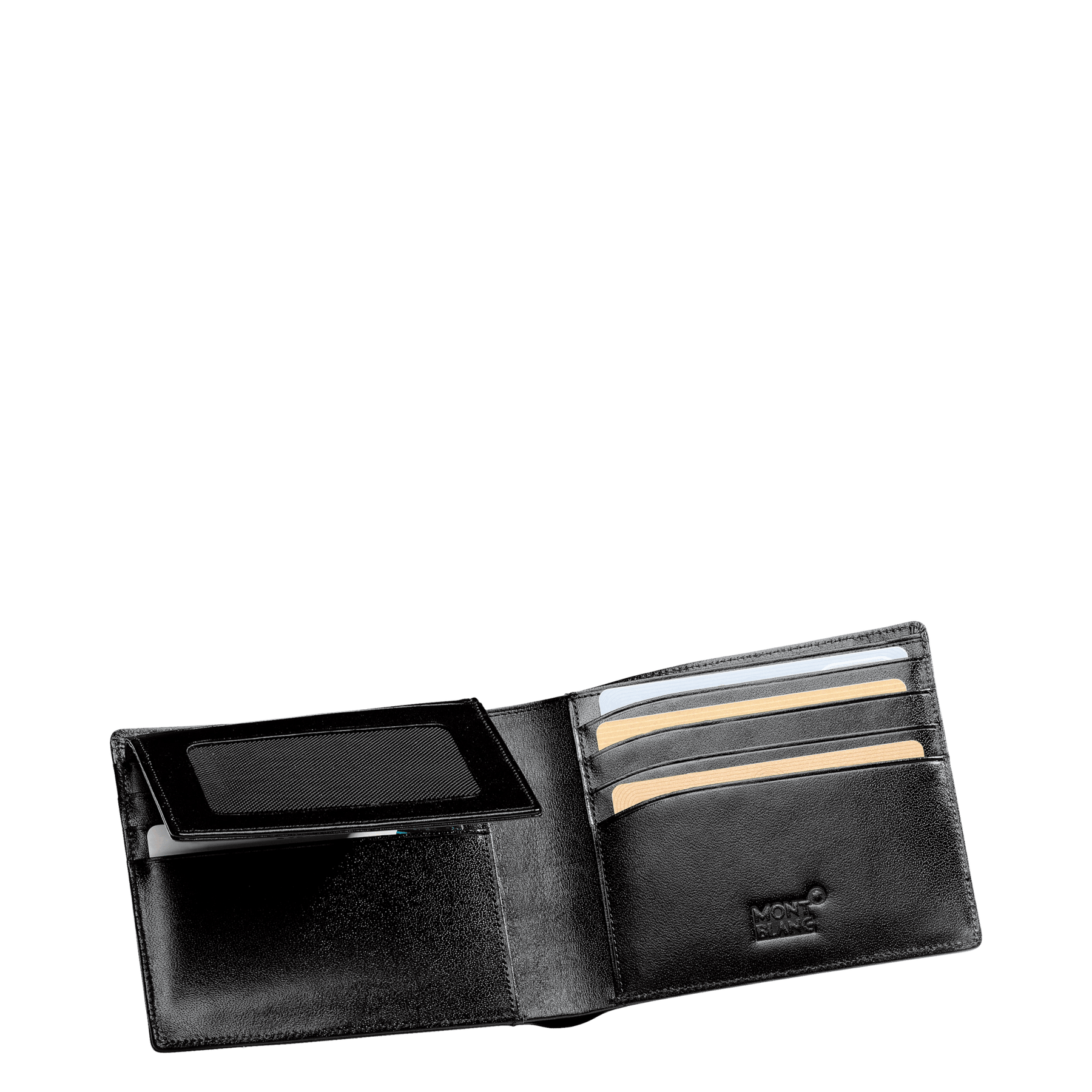 11-rums pung, i europæisk fuldnarvet kalveskind, eksklusiv Montblanc skinnende sort, jacquardfor med Montblanc mærke, Mont-blanc emblem med palladiumbelagt ring, gennemsigtig lomme, 11 lommer til kreditkort, lille gennemsigtig lomme, rum til sedler, ekstra lomme.