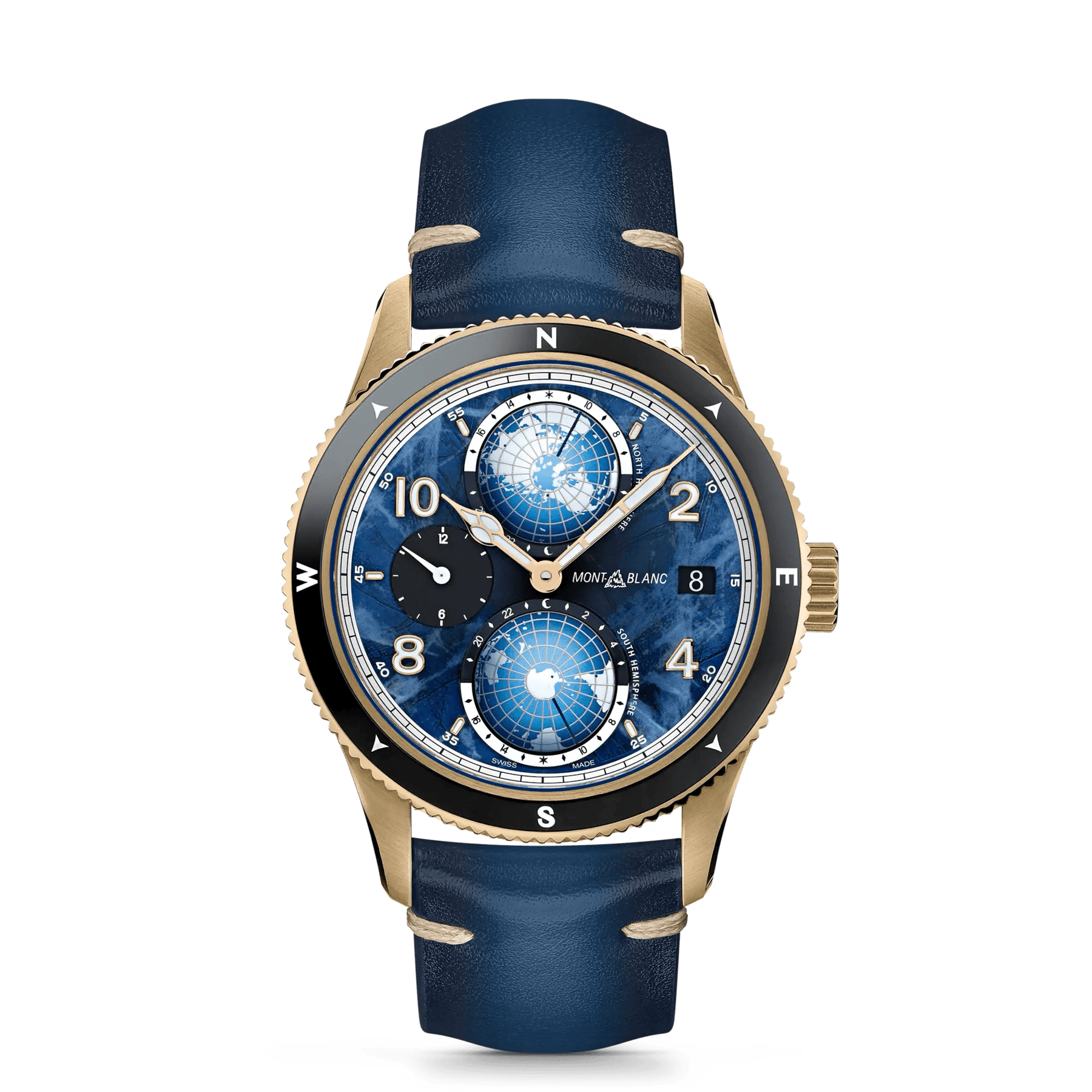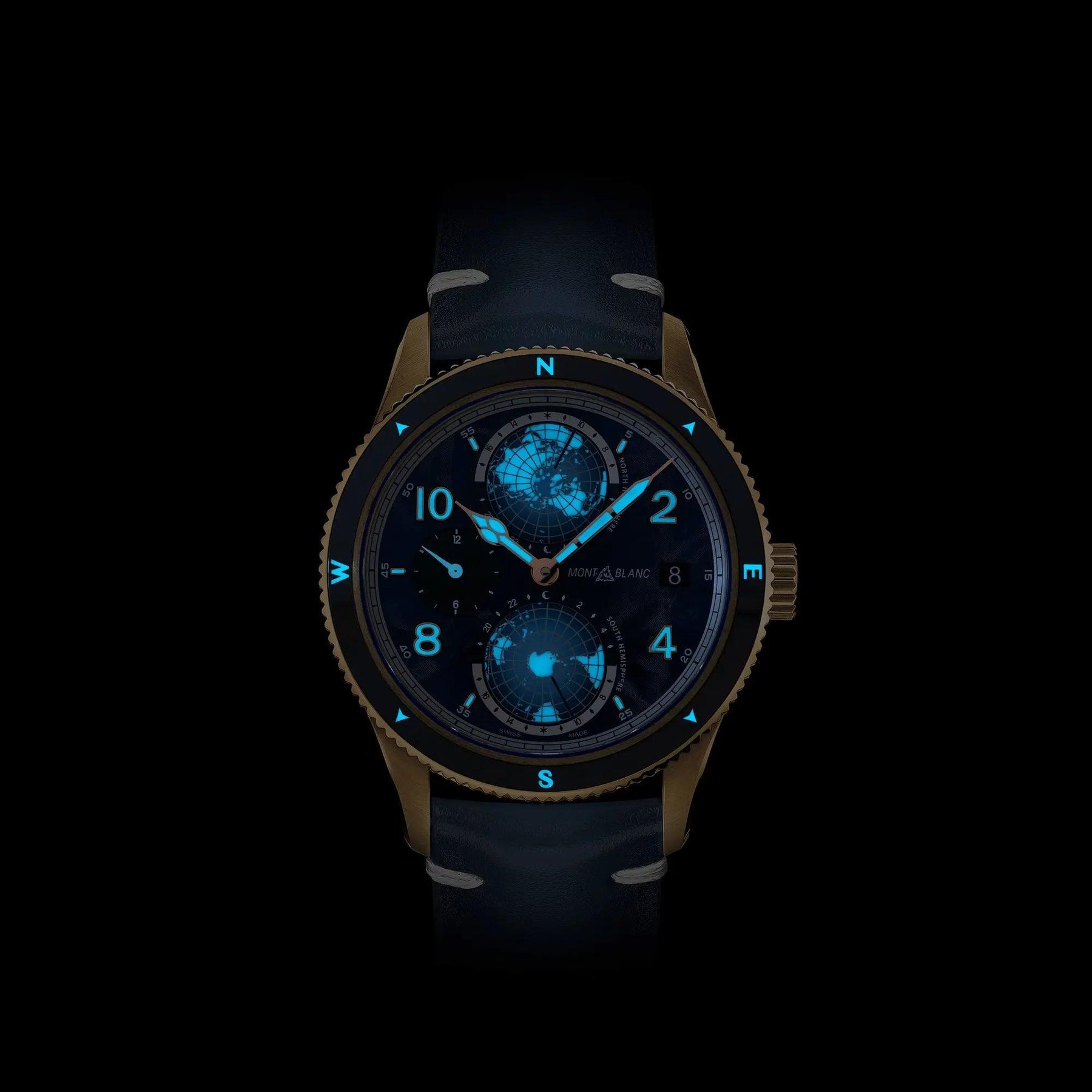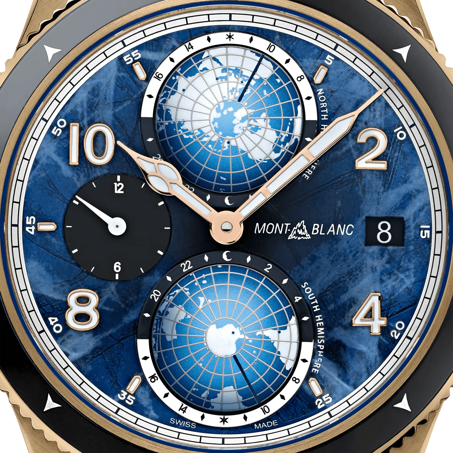 Montblanc 1858 Geosphere 0 Oxygen Limited Edition er fuldstændig iltfri for at forbedre urets ydeevne og nøjagtighed over tid, selv i de mest udfordrende bjergmiljøer. Det totale fravær af ilt inde i bevægelsen undgår ikke kun dugdannelse, som kan opstå i tilfælde af pludselige temperaturændringer i højden, men forhindrer også oxidation. Takket være fraværet af ilt holder alle komponenter meget længere, hvilket sikrer endnu mere præcis præcision over tid. Uret har en 42 mm bronzekasse med en tovejs riflet keramisk kant med selvlysende kardinalpunkter og en skive med Maisons "gletsjer"-mønster. Uret er drevet af MB 29.25 automatisk urværk med intern komplikation. Som alle 1858 Geosphere-modeller er både den nordlige og den sydlige halvkugle repræsenteret med to tredimensionelle glober og inkluderer en dag/nat-indikator, så brugeren kan vide, hvad klokken er overalt i verden med et øjeblik.