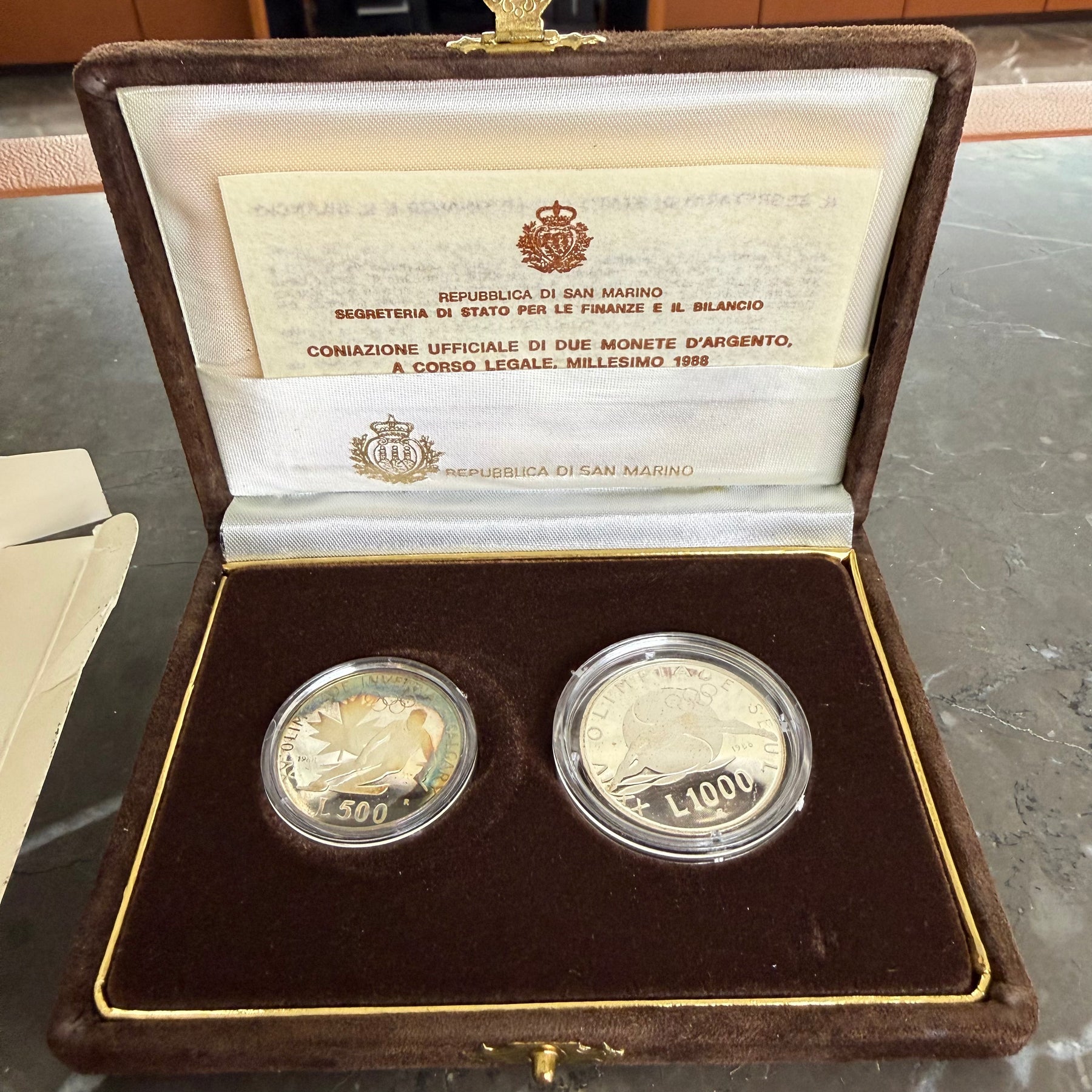 Sæt med to erindringsmønter i 835‰ sølv fra Republikken San Marino, præget i 1988 med status som lovligt betalingsmiddel i San Marino og Italien. 500 lire mønten har en diameter på 29 mm og en vægt på 11 gram, mens 1000 lire mønten måler 31,4 mm i diameter og vejer 14,6 gram. Begge fejrer de XV vinter-OL i Calgary og de XXIV. Olympiske Lege i Seoul, skabt ud fra skitser af kunstneren Maurizio Soccorsi i henhold til Regency Decree n. 23 af 1988. Autentiske numismatiske stykker med officiel statscertificering, perfekt til samlere af olympiske og historiske mønter.
