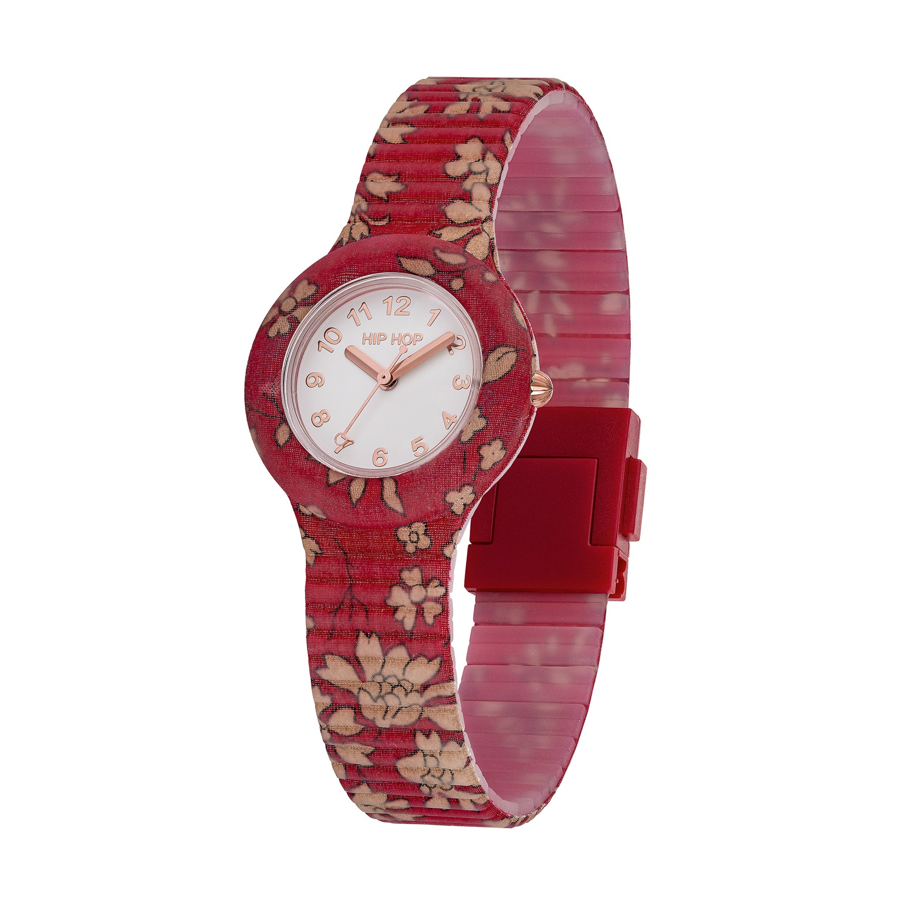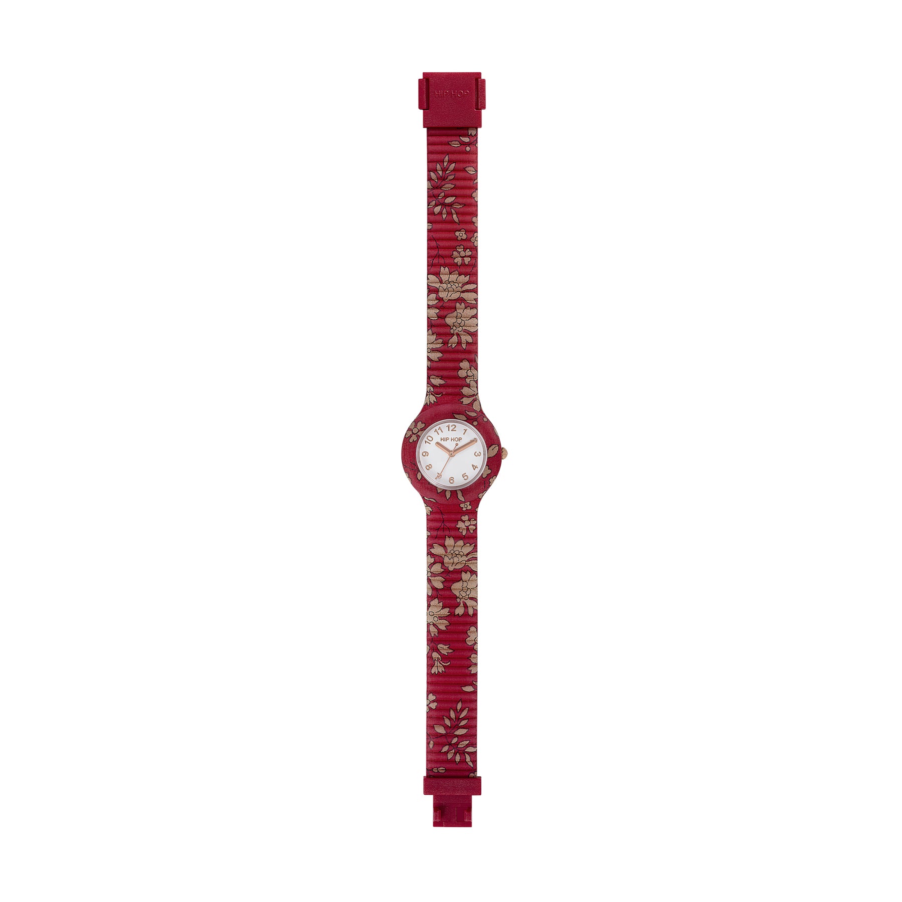 Die Winter Blossom-Kollektion zelebriert die Schönheit von Blumen, die dem Winterfrost standhalten, und vereint die Eleganz geblümter Liberty-Stoffe in einem raffinierten und trendigen Accessoire. Diese Uhr verfügt über ein Silikonarmband und rotes Liberty London-Baumwollpopeline, das mithilfe der RPL-Technik miteinander verschmolzen ist, und ihr weißes Zifferblatt ist mit roségoldenen Zahlen und Kugeln verziert. Perfekt für alle, die ihrem Outfit eine elegante und moderne Note verleihen möchten.