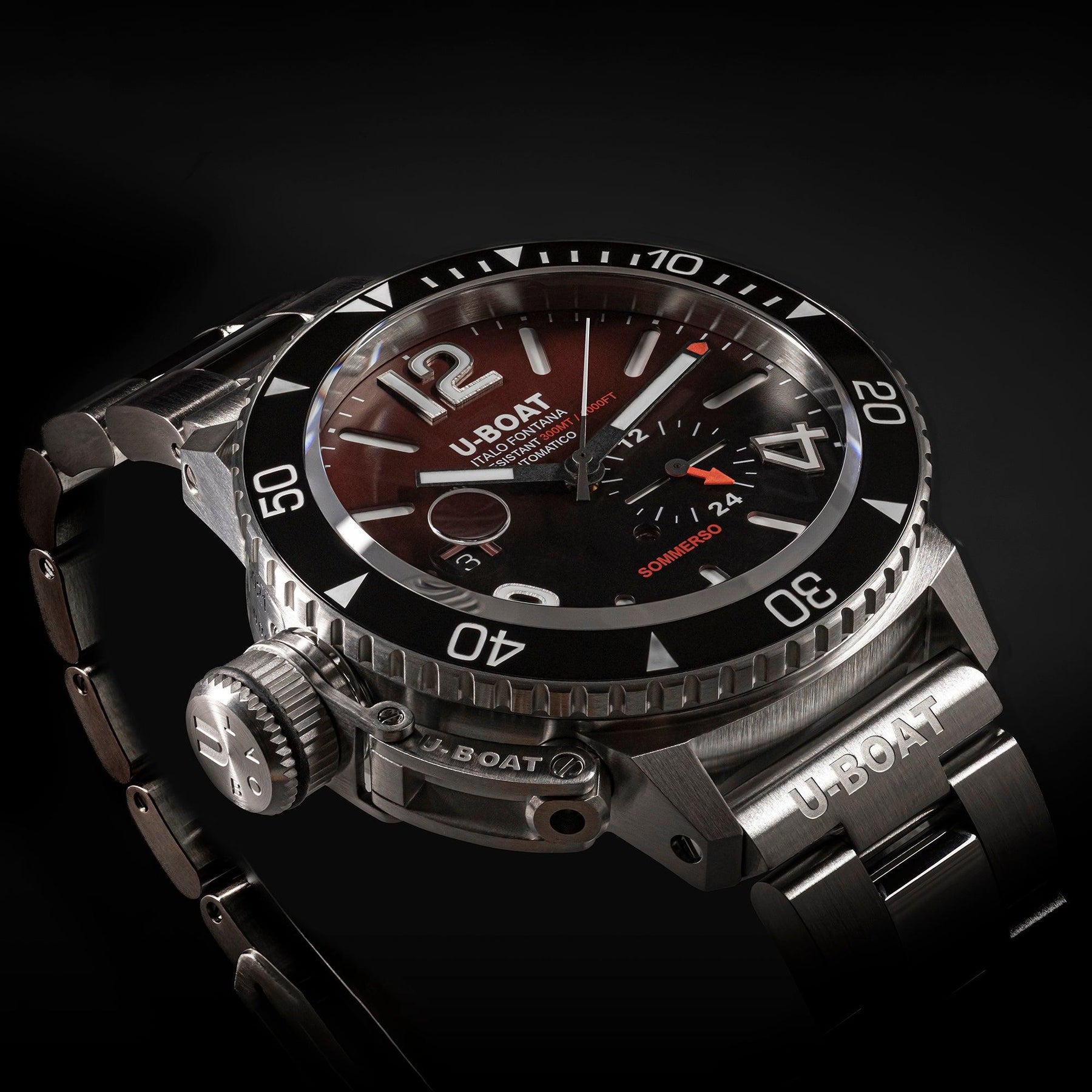 BEWEGUNG Schweizer Automatikwerk mit technischen Modifikationen an die U-BOAT-Spezifikationen. Frequenz: 28.800 Schwingungen/Stunde, 4 Hz. Gangreserve: 41 Stunden. 26 Rubine. Skelettierter Rotor. SW 200 gesattelt.