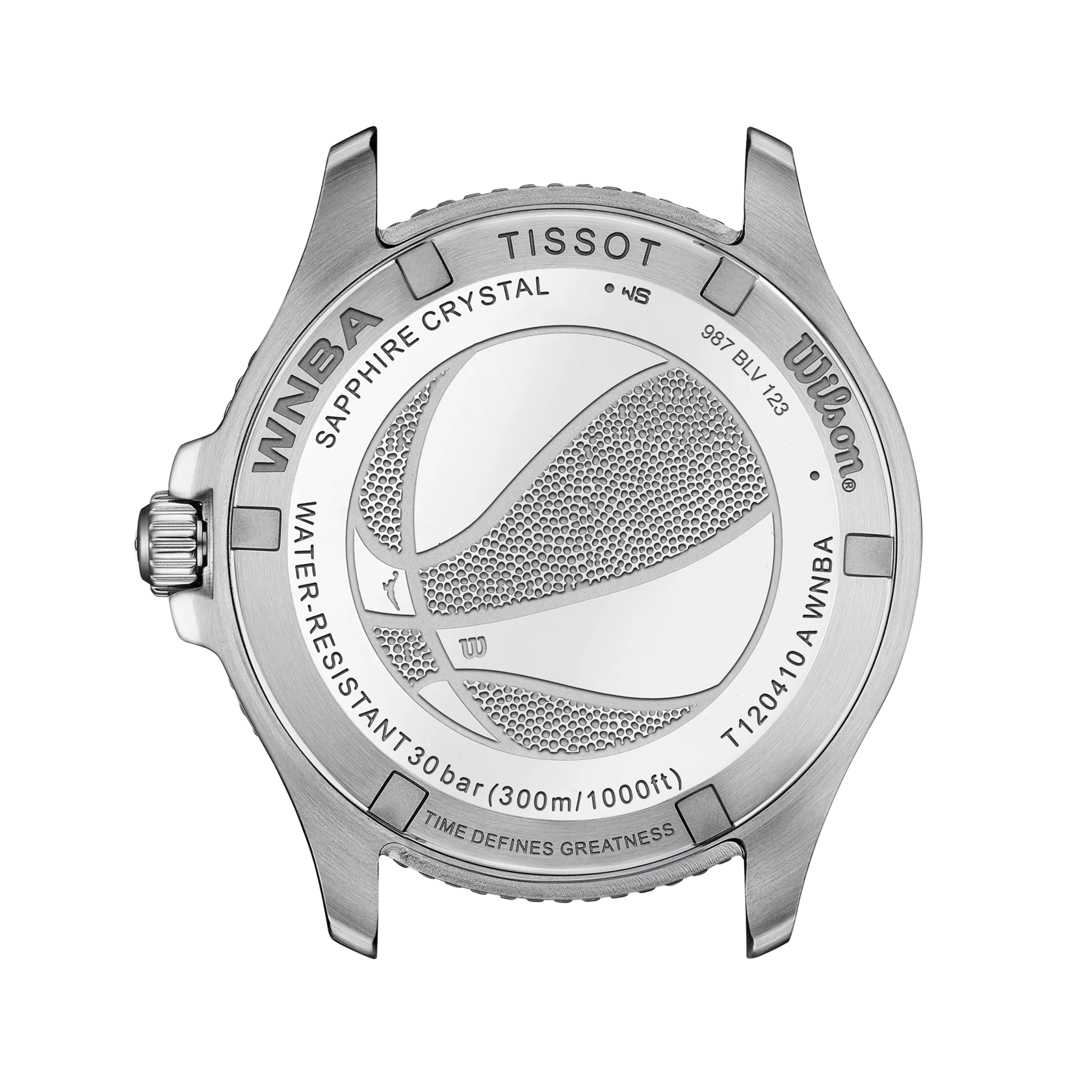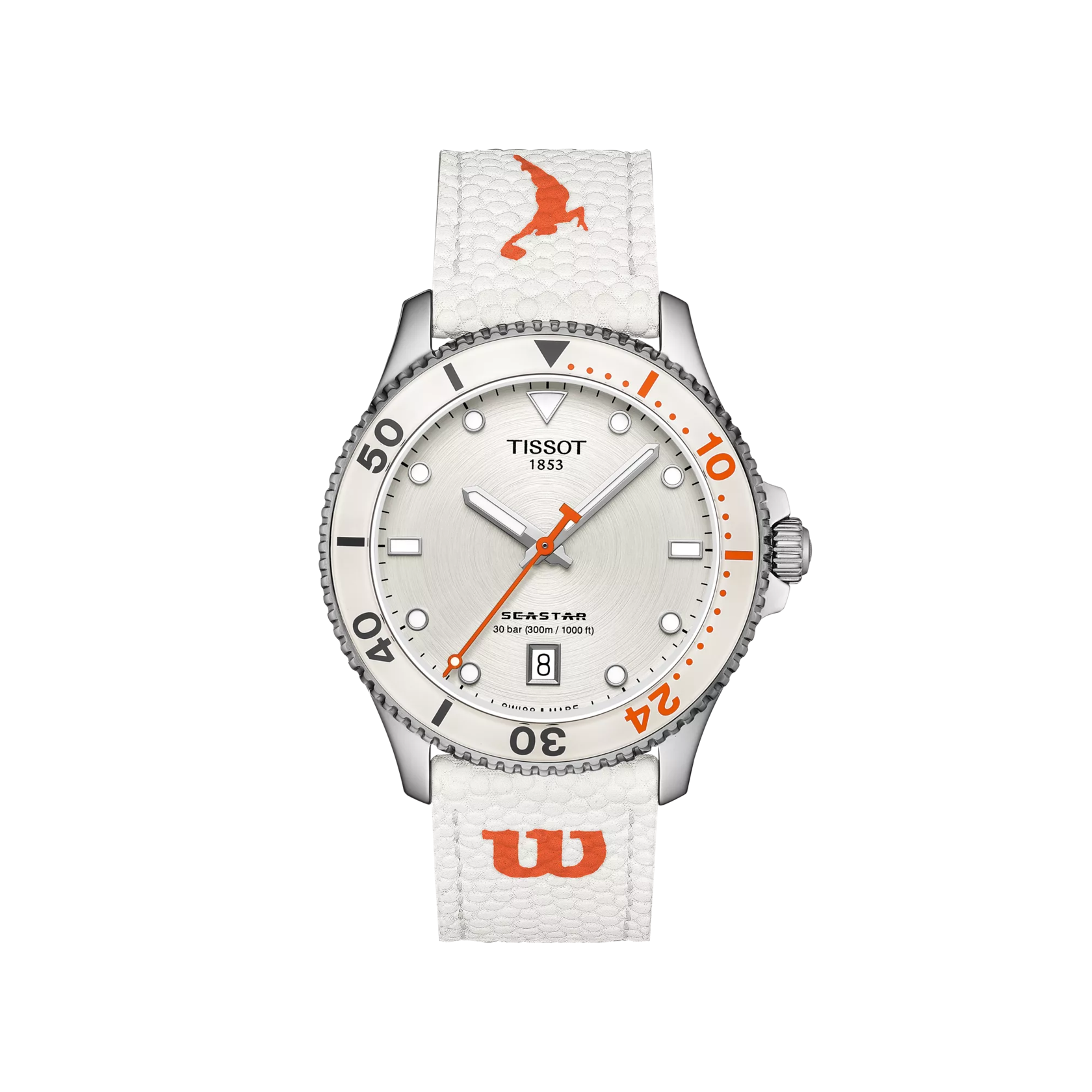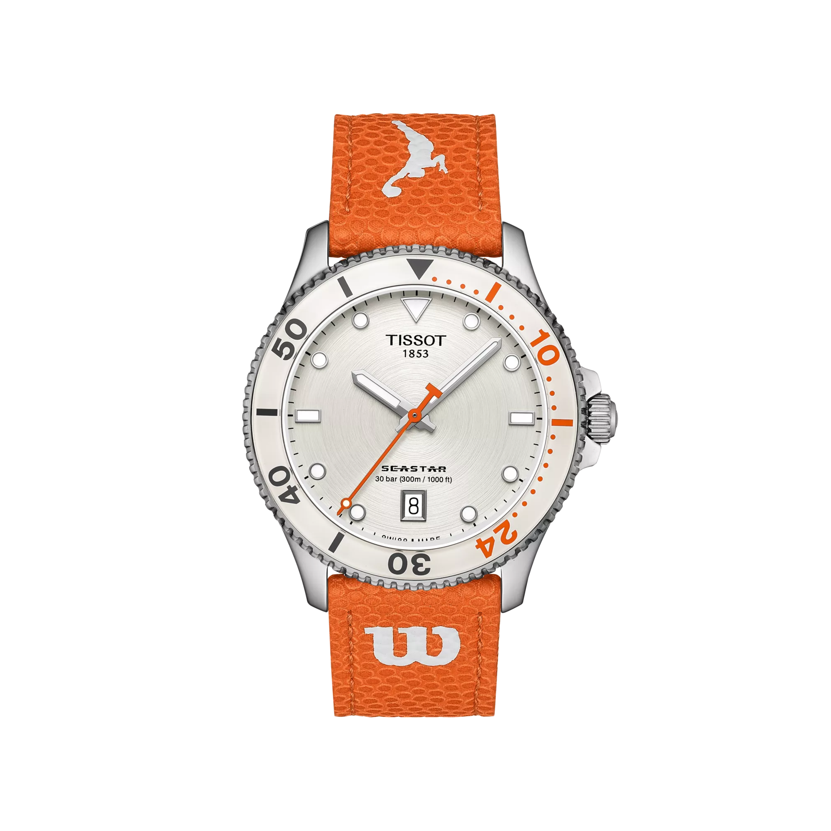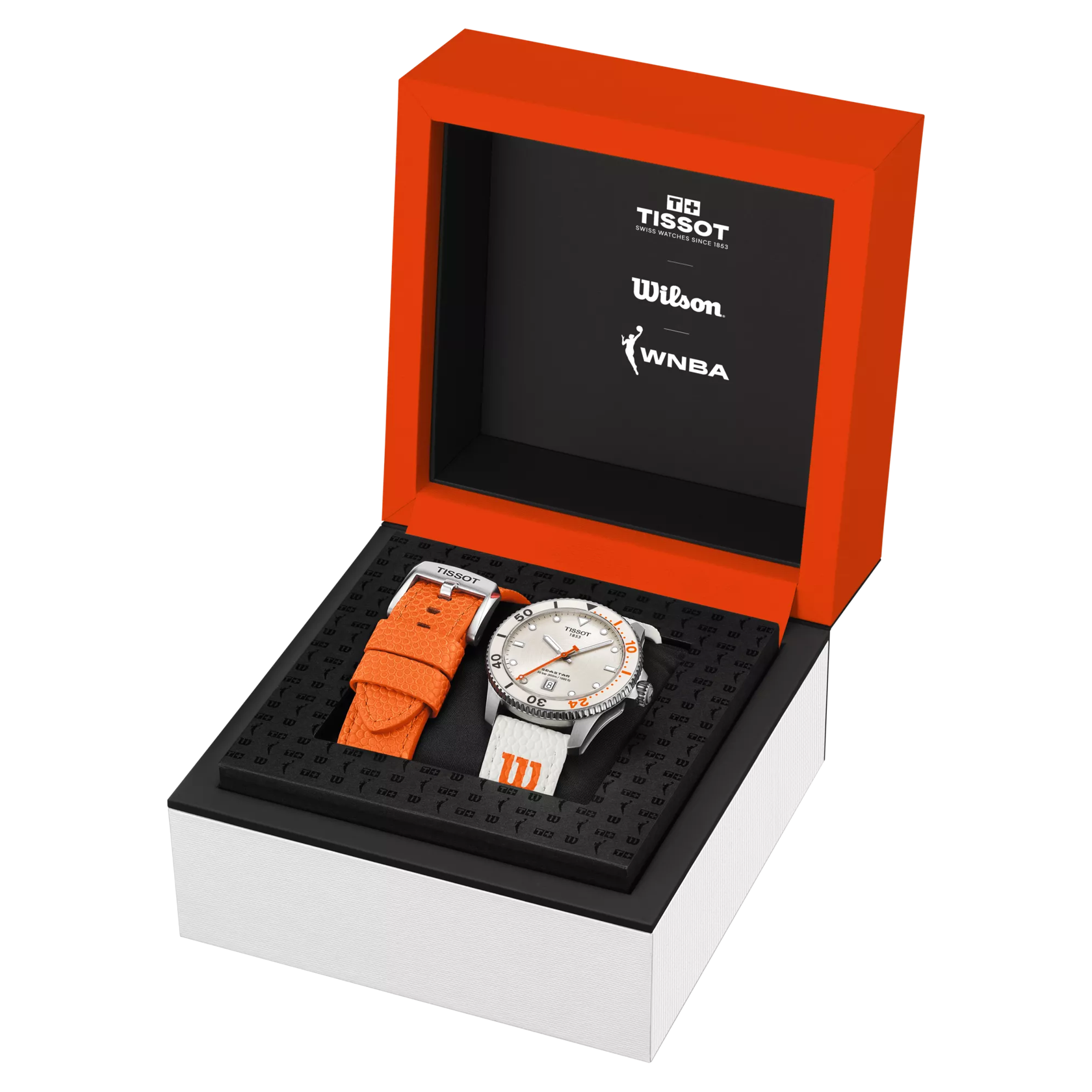 Entdecken Sie die Welt des Sports mit der Tissot Seastar Wilson WNBA-Sonderedition. Das Armband aus dem offiziellen Wilson WNBA Evo-NXT Premium Game-Verbundmaterial passt perfekt zu den Farben des Zifferblatts und integriert die Essenz des Sports direkt in die Uhr. Dank des Tissot-Armband-Schnellverschlusssystems können Sie aus einer breiten Palette kompatibler Armbänder für einen individuellen Look wählen.