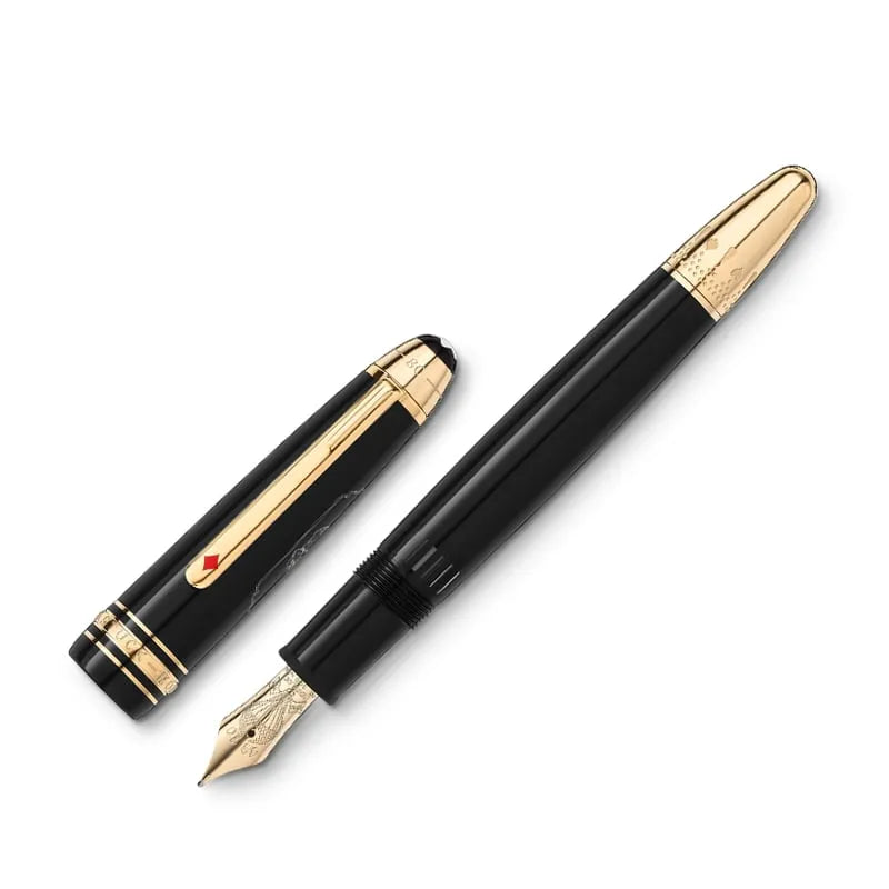 The Meisterstück Around the World in 80 Days collection is inspired by Jules Verne's famous adventure novel “Around the World in 80 Days”. The LeGrand fountain pen in precious anthracite resin draws inspiration from the second leg of the journey, from Bombay to Yokohama. In this second adventurous stage, the protagonists travel on a majestic elephant, which appears in a cartouche on the hood. The clip features a red lacquered Ace of Diamonds and the cone is engraved with a motif inspired by Princess Auda's jewels and card suits, representing Fogg's bet to complete the journey in 80 days. The top of the cap features embossing of the duration of the journey, 25 days from Bombay to Yokohama and 80 days in total. The writing instrument is completed by a handmade 14K gold nib, decorated with a hot air balloon and with the dates 20/10 and 14/11: Fogg leaves Bombay on 20 October at 8pm and Yokohama on 14 November at 6pm.