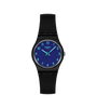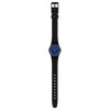 This small watch features a dark blue textured dial with light green printed numerals, light green hour and minute hands that glow in the dark, and a black seconds hand in a matte black case. The watch is completed by a matte black textured strap with a matte black buckle and loop.