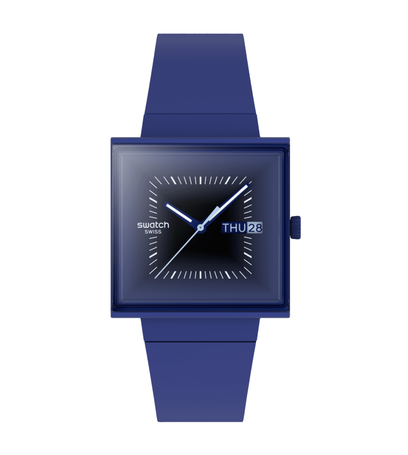 La caja cuadrada de Biocerámica de color azul oscuro mate cuenta con un vidrio de origen biológico de borde a borde que ofrece una vista lateral de la pista de minutos impresa en azul claro. La esfera cuadrada, negra y azul oscuro con degradado presenta manecillas de horas y minutos de color azul oscuro con un efecto fosforescente, un segundero de color azul claro y una ventana de fecha de color azul oscuro y azul claro en la posición de las 3 en punto. La esfera y la caja se complementan con una correa degradada en azul oscuro y negro mate, con una trabilla en azul oscuro mate y una hebilla en azul oscuro mate.
