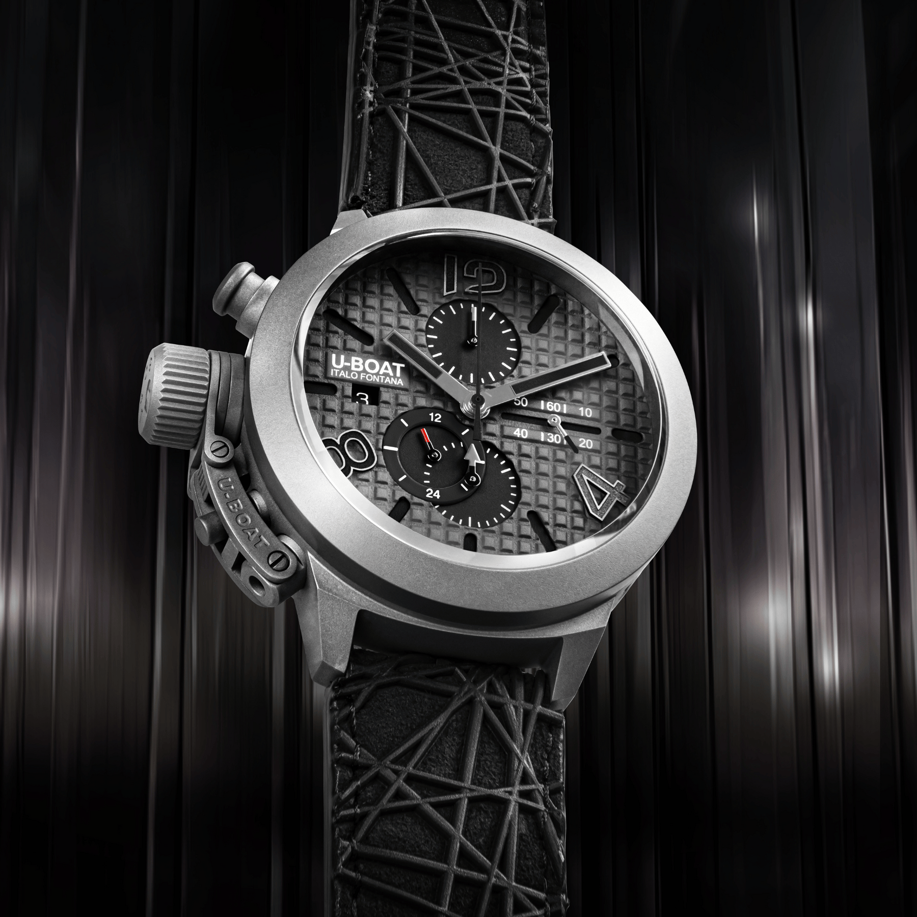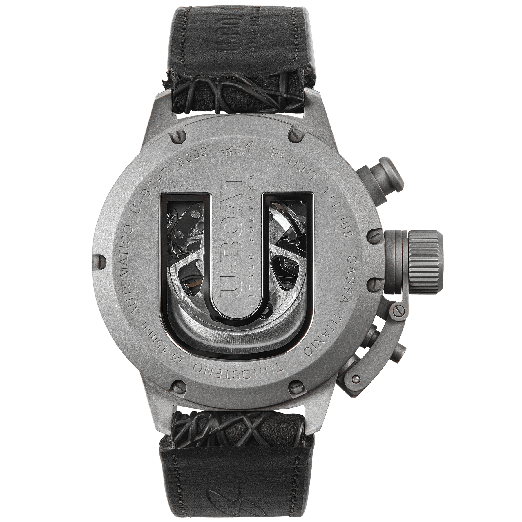LIIKKUMINEN mekaaninen automaattinen kronografi teknisillä muutoksilla U-BOATin eritelmien mukaisesti. Taajuus 28 800 tärinää/tunti, 4 Hz. Tehoreservi 62 tuntia. 25 rubiinia. Skeletonoitu roottori. SW 500 Sellita.