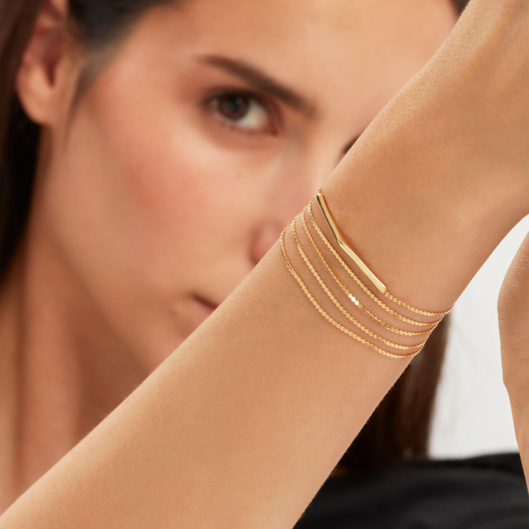 Le bracelet multitours B Whisper en acier doré présente un élément central rigide à la finition polie et un fermoir réglable. Il ressemble à une chaîne de 76,5 cm de long à enrouler autour de votre poignet. Un détail précieux parfait à porter au quotidien.
