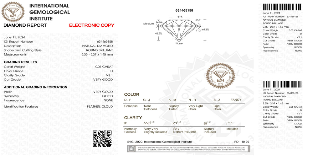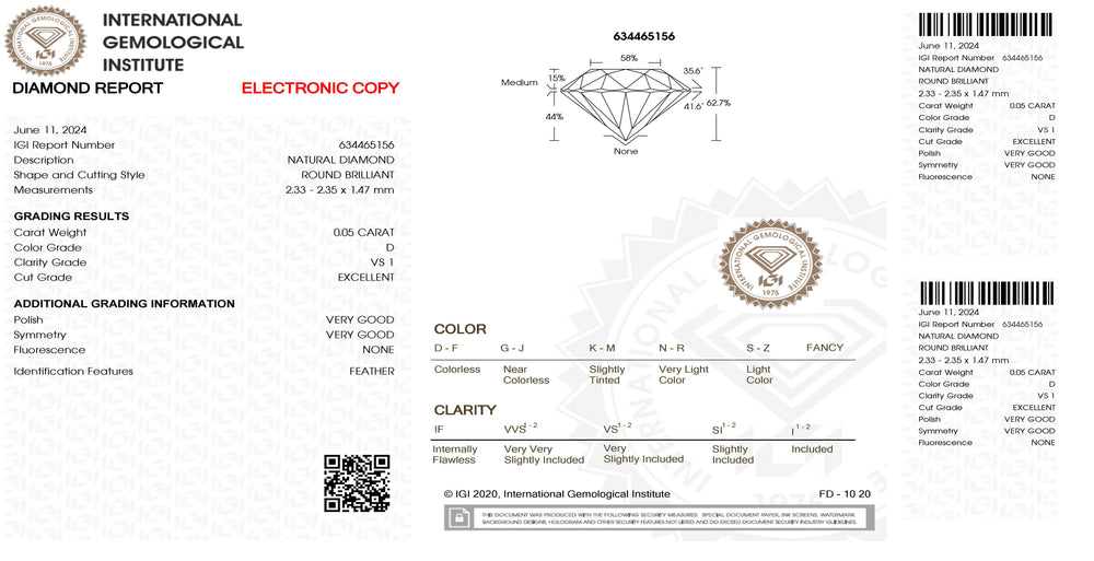 IGI gyémánt buborékfóliában tanúsított briliáns csiszolású 0,13 ct szín és tisztaság VVS 1