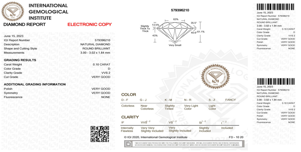 Diament IGI w blistrze, o szlifie brylantowym, o masie 0,10 ct, barwie D, czystości VVS2