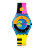 Este relógio retro ultrafino é inspirado num Swatch GENT dos anos 80: o colecionável FLUMOTIONS (GN102). O mostrador multicolorido apresenta um ponteiro das horas preto e um ponteiro dos minutos rosa em uma caixa transparente de origem biológica azul fosco com vidro de origem biológica. A pulseira inferior amarela fosca e a alça superior rosa fosco apresentam uma impressão multicolorida e são complementadas por uma presilha transparente fosca e uma fivela transparente amarela fosca.