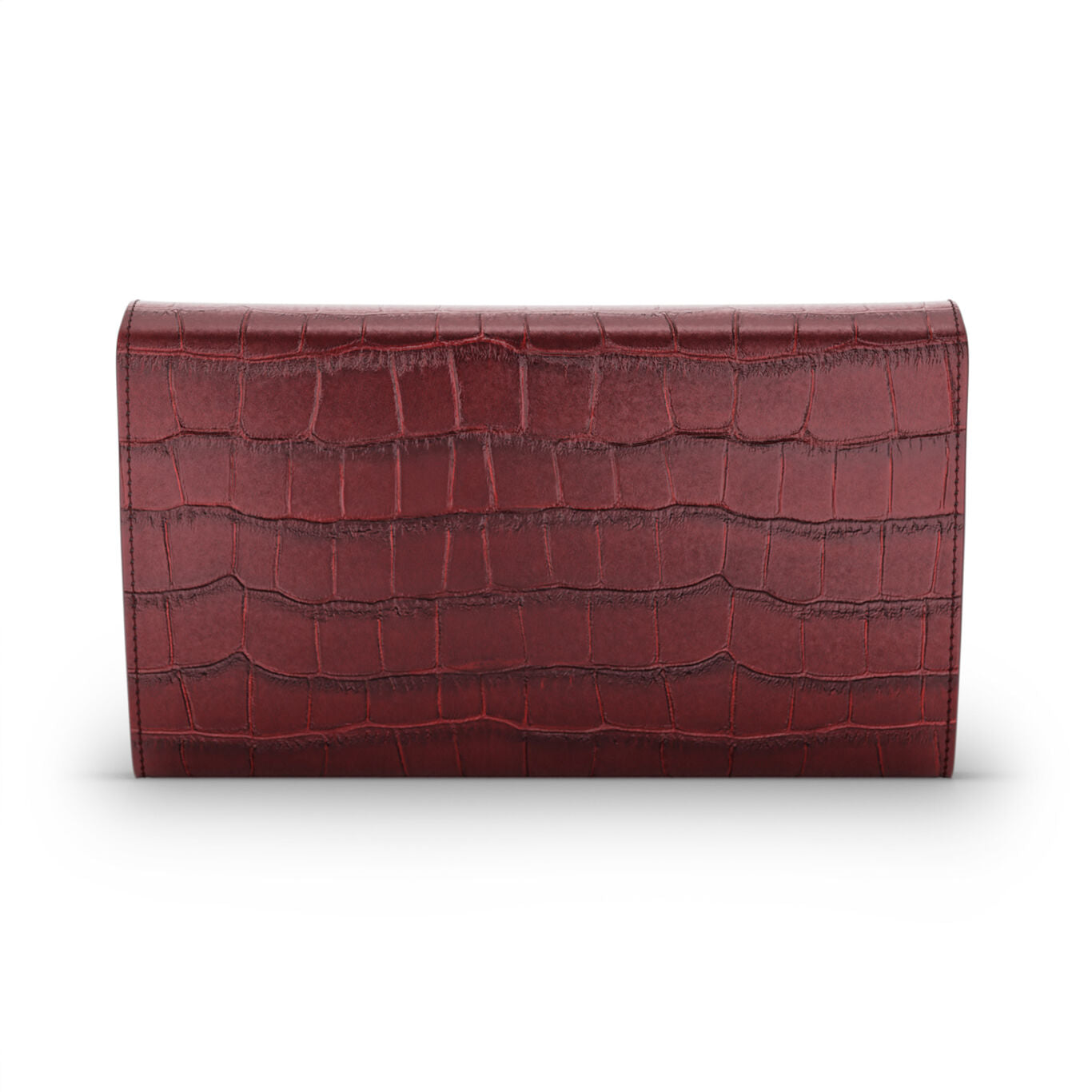 Un accesoriu clasic atemporal, acest portofel este realizat manual din piele fină de croco bordeaux: o piele de vițel strălucitoare de înaltă calitate, lucrată pentru a reproduce cu rafinament textura crocodilului. Elegant si functional, ofera o organizare impecabila datorita a sase sloturi pentru carduri, a doua buzunare mari cu burduf pentru bancnote si a unui buzunar spatios pentru monede cu inchidere cu fermoar. Clapeta centrală, împodobită cu o închizătoare de bijuterie din bronz alb reprezentând un leopard sprijinit pe un cristal mare incolor într-o tăietură ovală fațetată, adăpostește un buzunar suplimentar care corespunde unui compartiment simetric pe partea opusă.