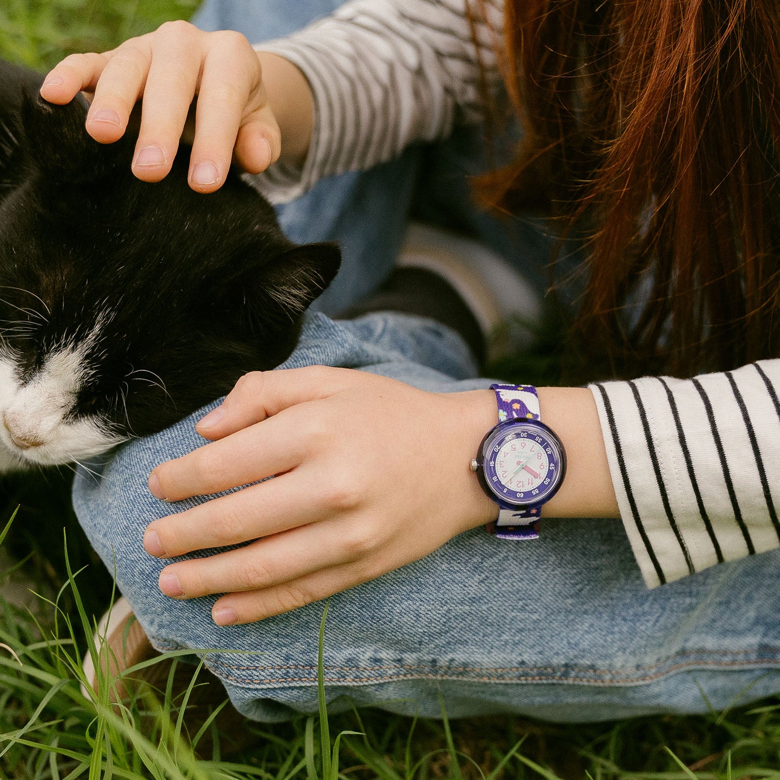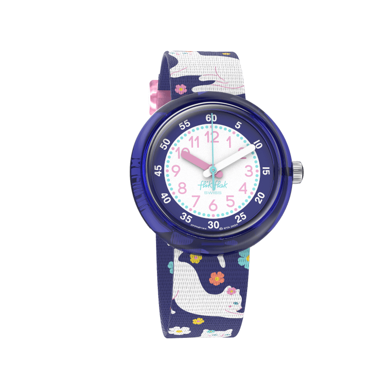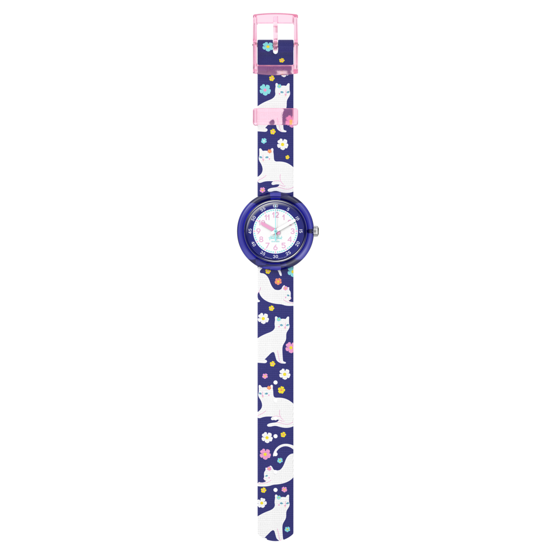 FANCY CAT este ceasul potrivit pentru copiii care iubesc pisicile! Un cadou perfect, cu motivul său floral pe fond albastru, pentru a învăța să spui ora.