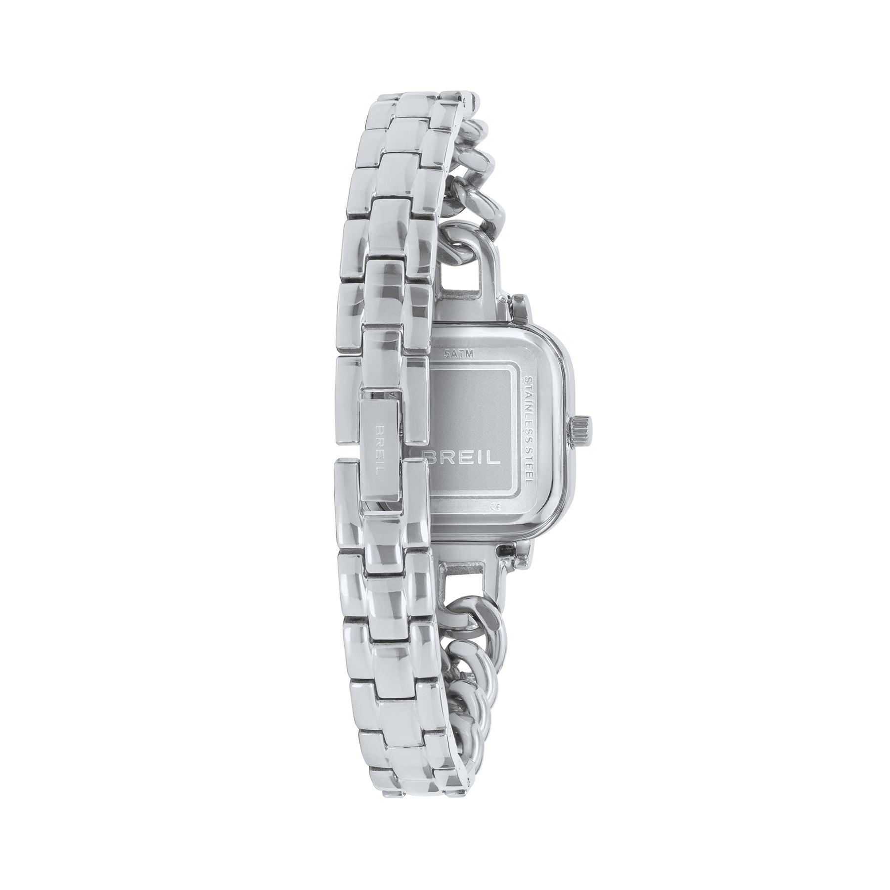 Élise damklocka kombinerar sofistikering och karaktär i en tidlös design. Den definieras av en kvadratisk boett i polerat stål och en silverurtavla med solstråleeffekt, som fångar ljuset med varje rörelse. Indexen, i UPMR-silver och kristaller, ger en touch av diskret men sofistikerad briljans. För att komplettera utseendet, stålarmbandet med groumette kedja.